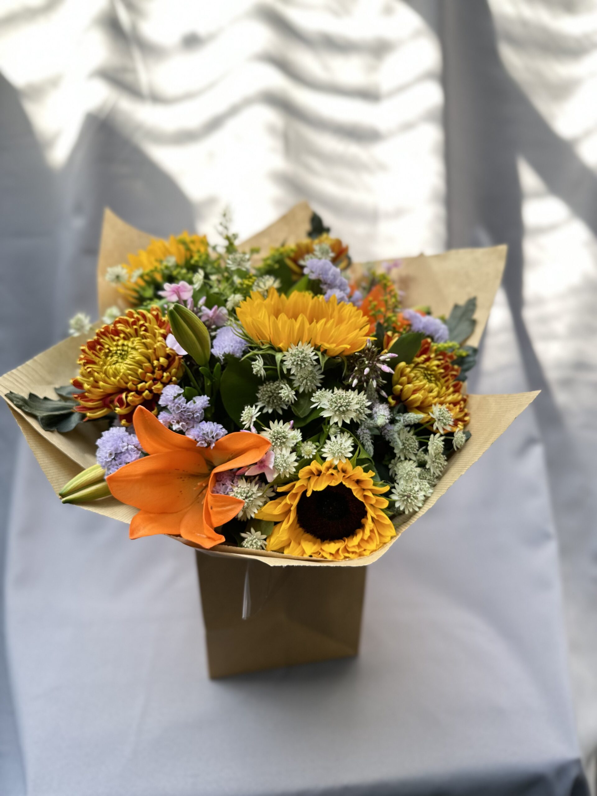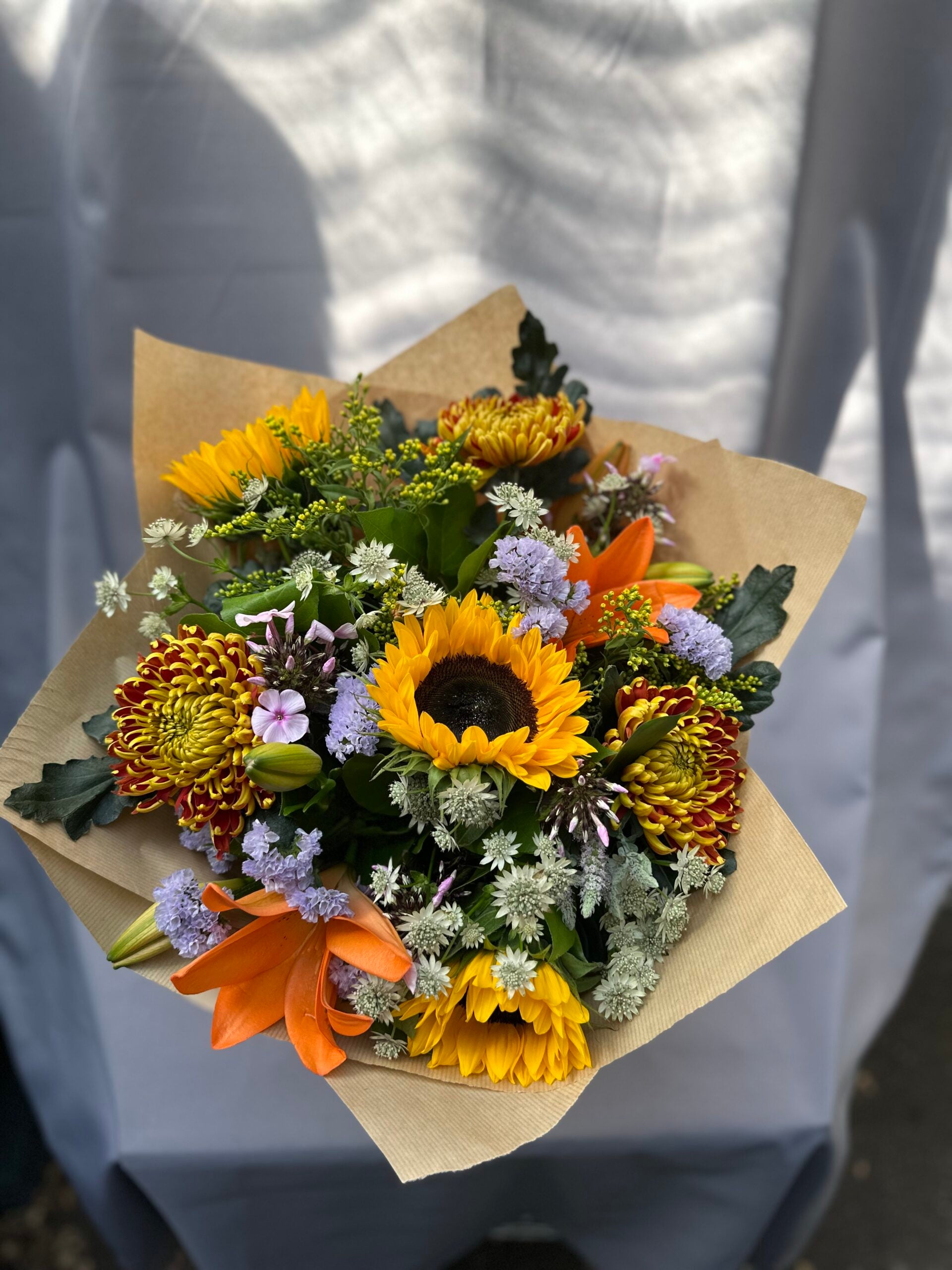 Featuring Sunflower, Fuego blooms, Astransia, white Phlox, Solidago, lilac Statice, orange Asia lily, greenery.